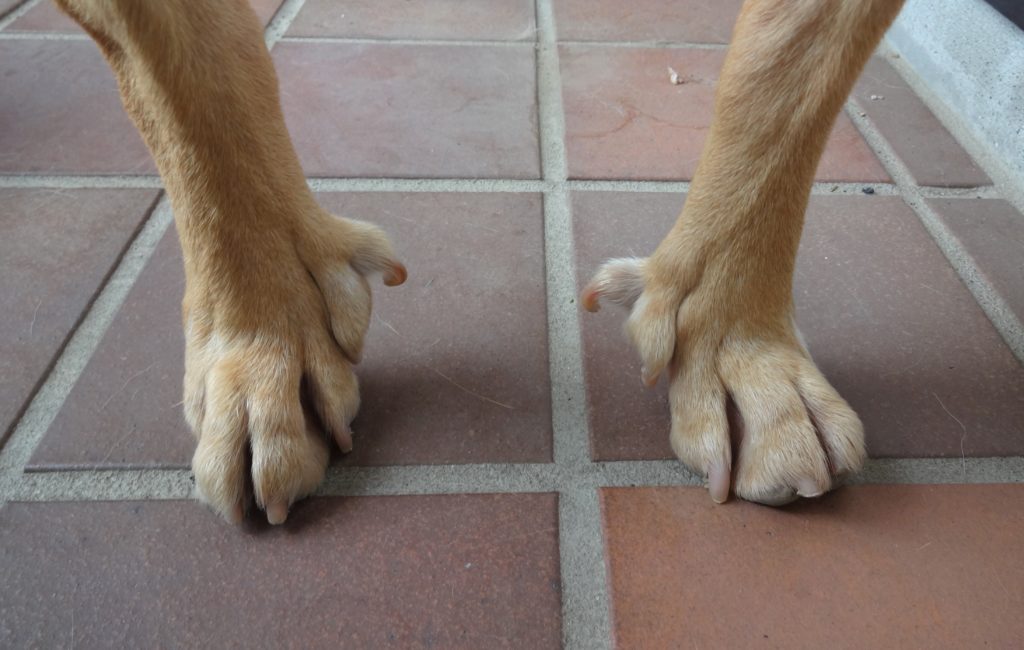 犬の足に、何本の指があるか、ご存知でしょうか? 答えは、前足には5本ずつ、後ろ足には4本ずつで、全部で18本です。前足の内側、地面に接しない少し離れた場所に指があります。人の手足で言えば、親指(母指)にあたり、この指の爪を「狼爪(ろうそう)」と言います。これに対し、後ろ足には、多くの場合、狼爪は無く、指は4本です。