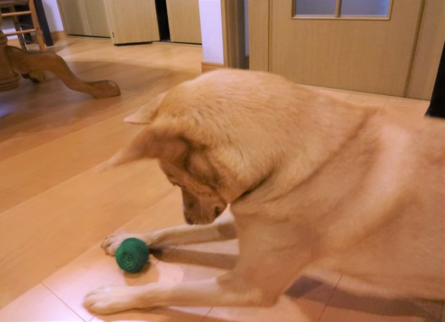 ボール投げ遊びはともかくとして、一人で遊ぶことは好きなようで、特に散歩から帰ったあとの興奮しているとき、お気に入りのおもちゃに向かって飛びかかったり、まるで小さな獲物を捕まえるような感じです。けっこう、飽きずに長くいこと、戯れています。