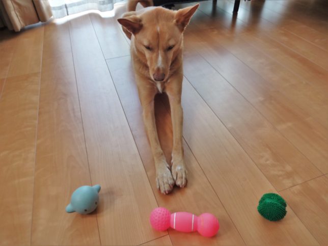 中でも一番の好きなのは、右端のプチプチ。正式な商品名は、DoggyManの「チクチクボール」といいます。このプチプチは、柴犬のとむが大好きだったのですが、ゆうも気に入ったようです。噛んだ時の感触がとっても気持ち良いらしく、隠れた(?)ヒット商品なのかなと思っていますが、とむとゆうだけでしょうか。