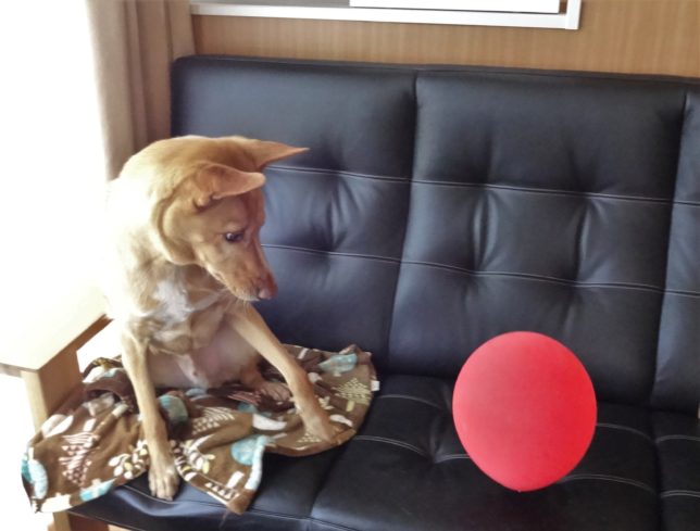 この前、義母から、風船をもらいました。でも、ゆうにとって、普段、見かけない、ちょっと大きな風船は、得体のしれない物体。コワいらしくて、恐る恐る臭いを嗅いだあとは、近寄ろうとしませんでした。