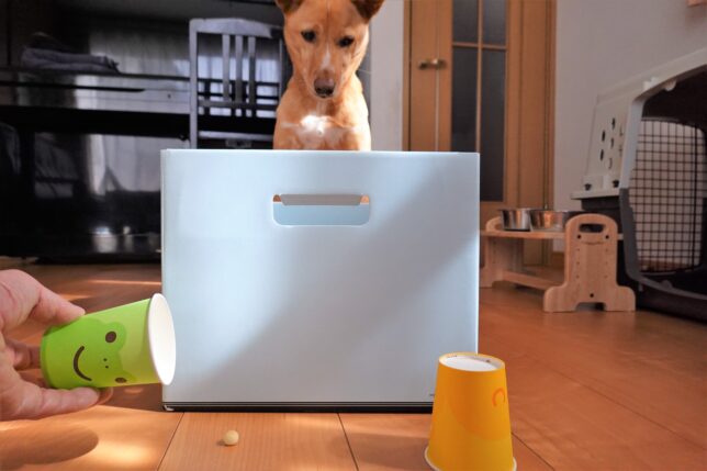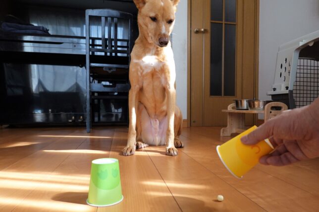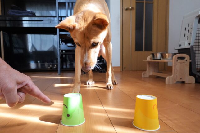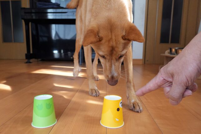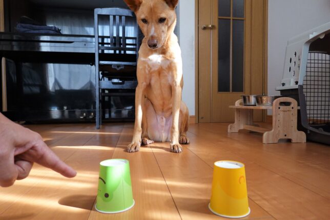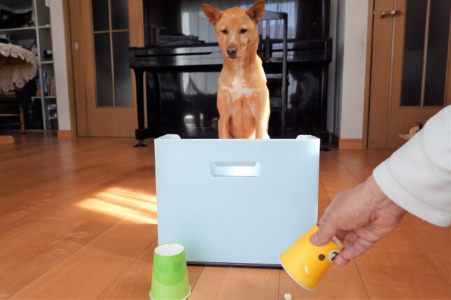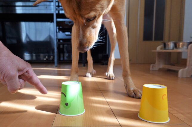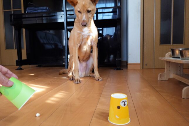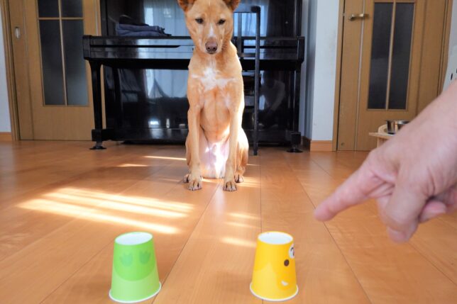ゆうは、指をさしたほうの紙コップへ。これもクリアしました。(ちなみに、指差しの意味が理解できるのは、犬が持つ特別な能力なのです。)