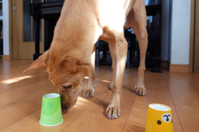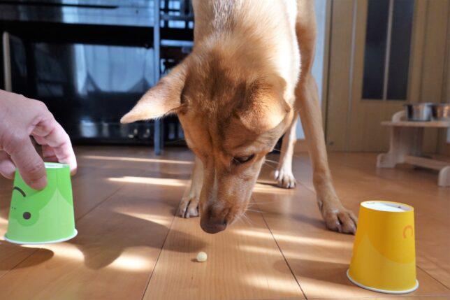 自分の目で、おやつが右の紙コップに入っていたのを見ていたはずですが、私が指をさしている左の紙コップを最初に確かめに行きました。自分の目で得た情報より、私(飼い主)の示すほうを選んだわけです。(今回は、あくまでも遊びですが、人からの指示(情報)を優先に判断することを示す実験結果があるそうです。)さて、ゲームはここまで。ゆう、お疲れ様。