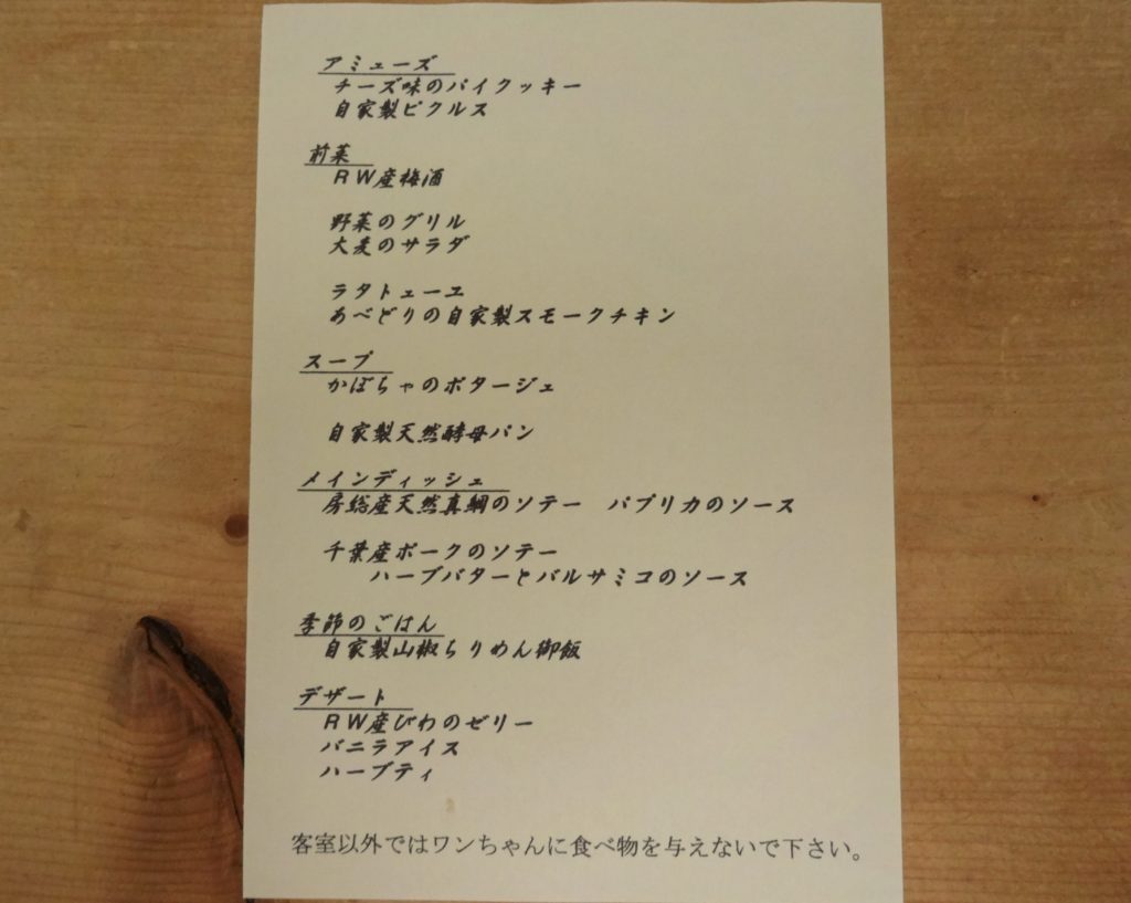 夕食は18:30から。お料理はこちらのもうひとつの魅力。オーナーの奥様が作られている洋風の料理ですが、丁寧に作られているのが伝わります。今回のお料理はこんな感じでした。