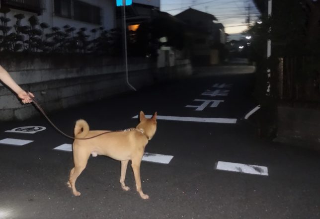 夕方の散歩は、日暮に近い時間から。歩いているうちに陽が沈んできます。暗くなってくると、見えづらくなってきますので、懐中電灯で照らして歩きますが、人と犬では、見えている景色は違うようです。