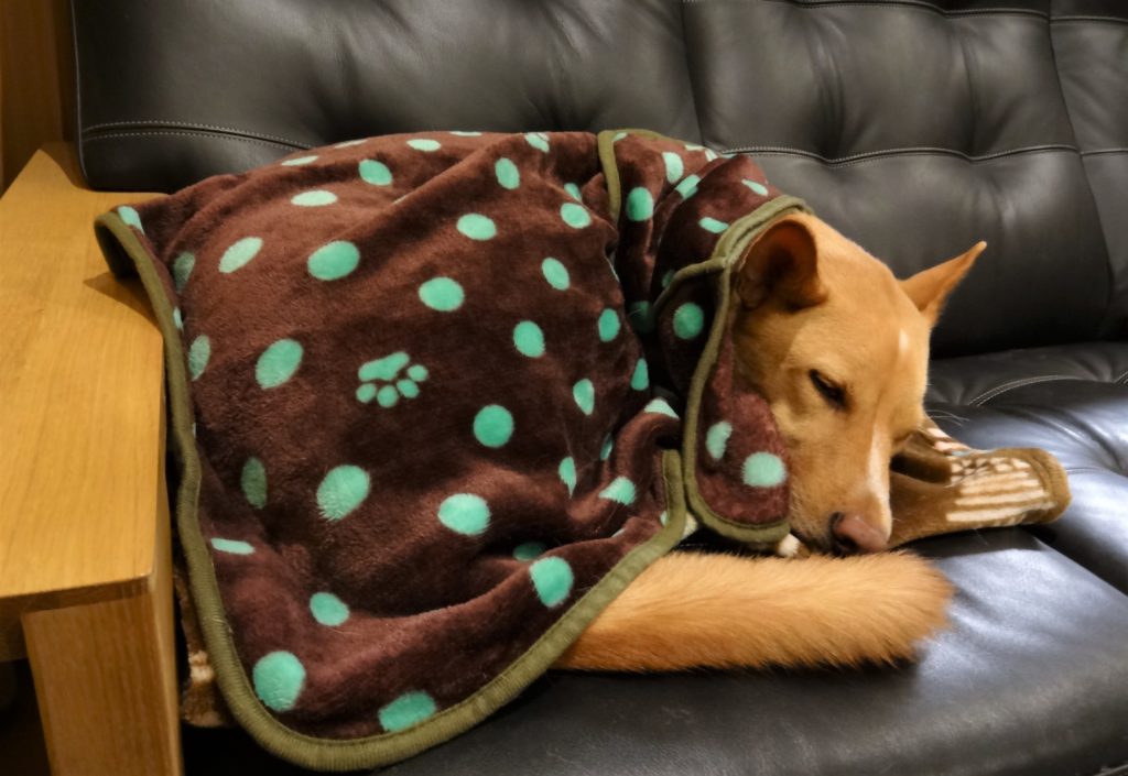 夜、寝るときは床暖房も切ってしまうのですが、このところ寒くなってきたので、ソファにブランケットを敷いたところ、ブランケットの上で丸くなり、すぐに寝てしまいました。朝、起きてリビングに入ると、そのままブランケットの上で寝ていましたので、すっかり気に入ったようです。