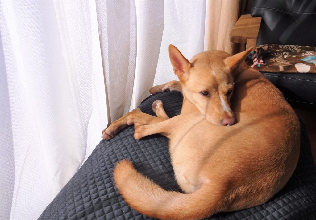 朝は、散歩の時間ぎりぎりまで、ソファで丸くなって寝ていて、支度を始めると、そろそろかな、という感じで、ようやく起きだします。寒くなると布団からなかなか出られない人間と似ているのかも。