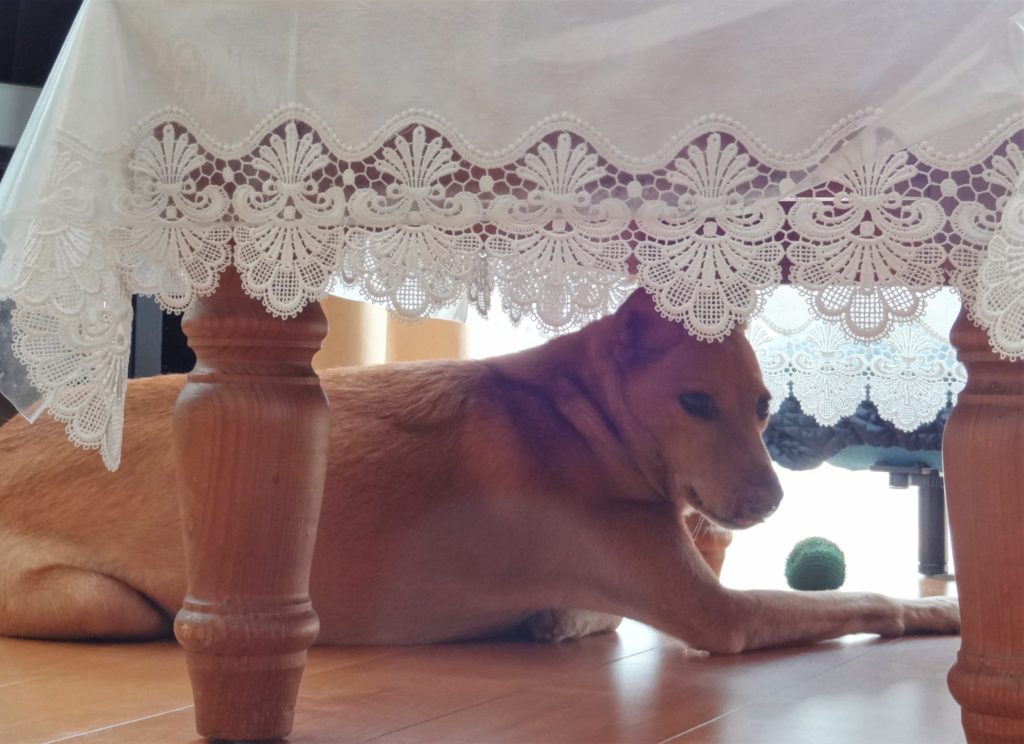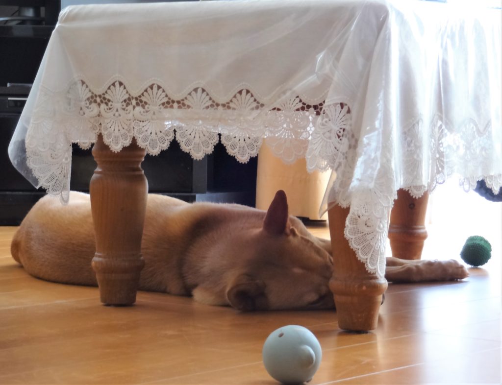 リビングには床暖房を入れているので、テーブルの下は温まった空気で、こたつの中のようになってます。こたつがない我が家で、ゆうだけが、こたつの温もりを満喫しています。